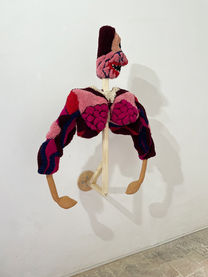 Your attention is then drawn to Untitled, a wall sculpture constructed from a tufted head and torso and ceramic hands mounted on a wooden stand. Its patterns are inspired by female anatomy, revealing muscle and bone. Addressing women’s objectification and sexualisation, this work explores the 18th century Anatomical Venus: the morbid, oversexualized, life-sized wax models of women designed to teach anatomy. Formed of layers that could be pulled apart to reveal detailed recreations of inner organs, they represented pregnant women with incongruously orgasmic expressions. The exposed organs and disassembled bodies of these sculptures confront the objectification of women, even in death.